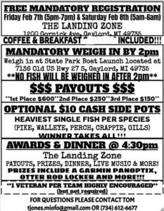 Mandatory Weigh in by 2pm. State Park Boat Launch 7136 Old US Hwy 27 S, Gaylord, MI 49735. Top 3 teams with the Heaviest mixed bucket of 10 fish. Fished being weighed are perch, crappie, bluegill and sunfish. Otsego Lake 8am-2pm. 1st Place $600, 2nd Place $250, 3rd Place $150.00. Awards & Dinner @ 4:30pm. For questions, please contact the event organizer.